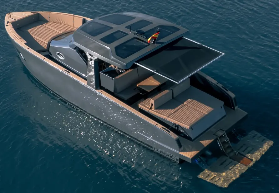 La filosofía de paseo se extiende a lo largo de los 16 metros del Pardo 50, plasmando su espíritu marítimo en cada detalle y momento a bordo. Sus líneas elegantes, su icónica proa invertida y sus amuradas elevadas crean un diseño impecable que integra el solárium de proa, una amplia zona de estar a la sombra de un techo en T de fibra de carbono de 16 metros cuadrados, y el solárium de popa, que se extiende con elegancia hacia la plataforma de baño.